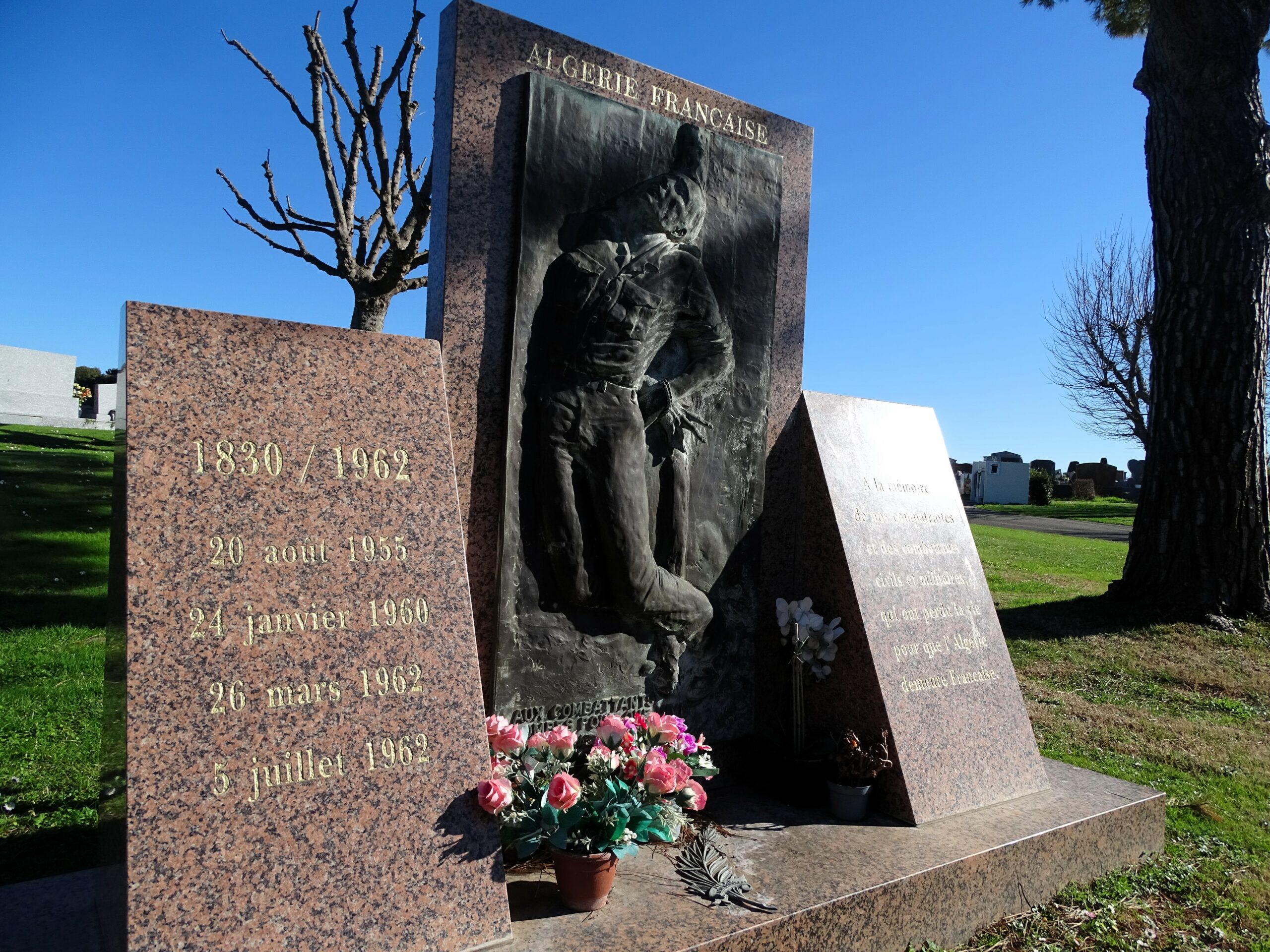À l’entrée du cimetière Saint-Laurent-Imbert, en bordure des pistes de l’aéroport Marseille – Provence, se dresse toujours la stèle à l’« Algérie française », érigée en 2005 par le maire (ex-FN et MNR) Daniel Simonpieri. La justice, pourtant, avait ordonné dès 2008 son retrait. Mais deux ans après sa première élection, son successeur Eric le Dissès a fait voter son retour, avec la seule opposition de deux élues du PCF et du MRAP (mouvement contre le racisme et pour l’amitié entre les peuples). Seules ont disparu du marbre les dates d’exécution de quatre membres de l’Organisation armée secrète (OAS), organisation terroriste de l’extrême droite pro-Algérie française, une « apologie de faits criminels » avait cinglé en 2011 le Conseil d’État. Suffisant pour passer sous les fourches caudines de la justice. “Le tribunal administratif de Marseille a estimé qu’elle était légale”, justifie la municipalité, citant le jugement rendu en 2012.