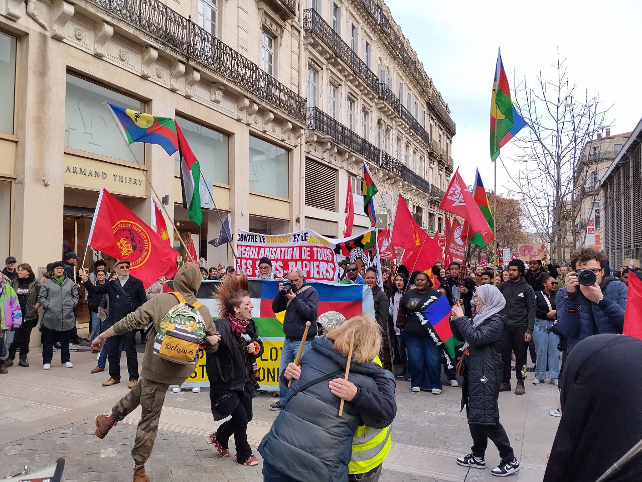 Chants, batucada, techno… la diversité était au rendez-vous dans le cortège de la marche des solidarités, ce samedi 14 mars dans les rues de Montpellier, où 2 000 personnes ont manifesté pour la défense des droits des personnes étrangères. Parmi les organisations à l’initiative de la mobilisation figuraient notamment la Cimade, le collectif Migrant·es Bienvenue 34, Droit au logement Montpellier, le Réseau éducation sans frontières 34 ou encore la Ligue des Droits de l’Homme. Cette manifestation s’inscrivait dans un appel national à se mobiliser contre le racisme, les violences d’État et la montée des idées d’extrême droite.