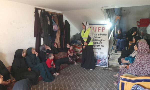 D’autre part les intempéries ont mis en danger vital les personnes déplacées dans des camps. Une mère de plusieurs enfants, du camp d’Al-Asdiqaa, témoigne dans un atelier de soutien aux femmes : « Cette nuit-là, l’eau entrait comme un torrent. J’ai creusé un petit fossé avec un bol pour changer le trajet de l’eau, mais elle ne s’arrêtait pas. Avant l’aube, tout était mouillé : les vêtements, les matelas, même la farine. Nous sommes restées debout dans la boue pendant des heures… Nous nous sommes senties vaincues ».