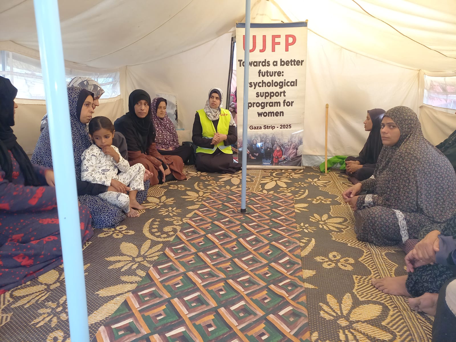 Dans cette réalité éprouvante, l’atelier de l’équipe UJFP avait l’objectif d’offrir aux femmes une pause psychologique pour quelques heures, et de leur transmettre un savoir pratique les aidant à protéger leurs familles et à réduire l’impact de la pluie et du froid à l’intérieur de tentes à peine capables de résister aux vents. Vingt-cinq femmes sont arrivées à la tente de la rencontre, les traits fatigués marqués sur leurs visages, portant avec elles des récits complets de nuits passées entre l’eau, la peur et la protection de leurs enfants contre le froid.
