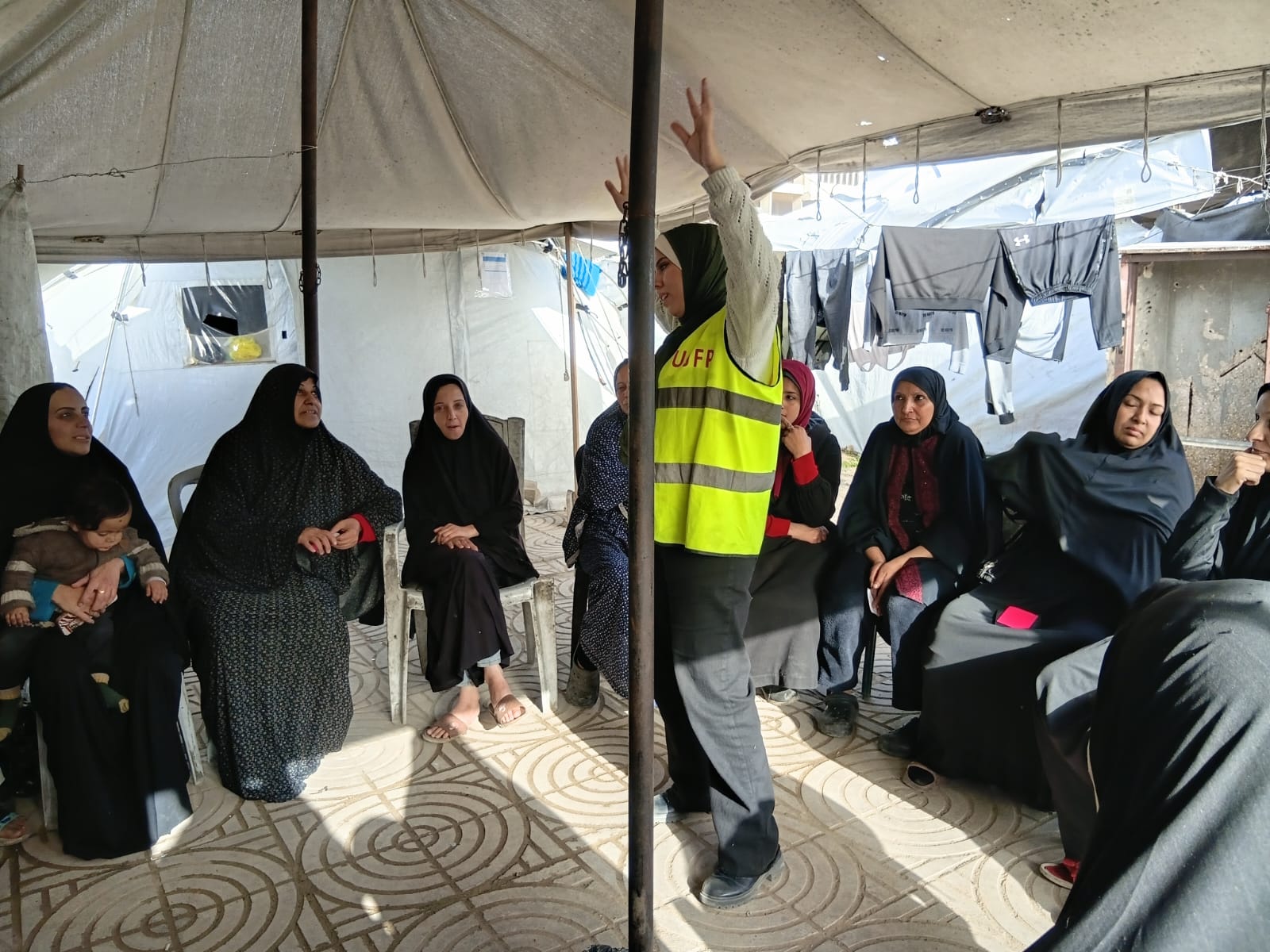 Le lieu était simple dans sa forme, mais chargé d’histoires non racontées et de lourdes questions en quête de réponses : qui nous écoute ? Et qui nous offre un espace pour dire ce dont nous avons besoin sans peur ni honte ? Entre les tentes serrées les unes contre les autres, où l’espace se rétrécit tandis que les soucis s’élargissent, vingt-cinq femmes déplacées se sont réunies pour créer ensemble un espace différent, un espace qui ne se construit pas de toile, mais de confiance, de reconnaissance et du désir de retrouver la voix perdue.