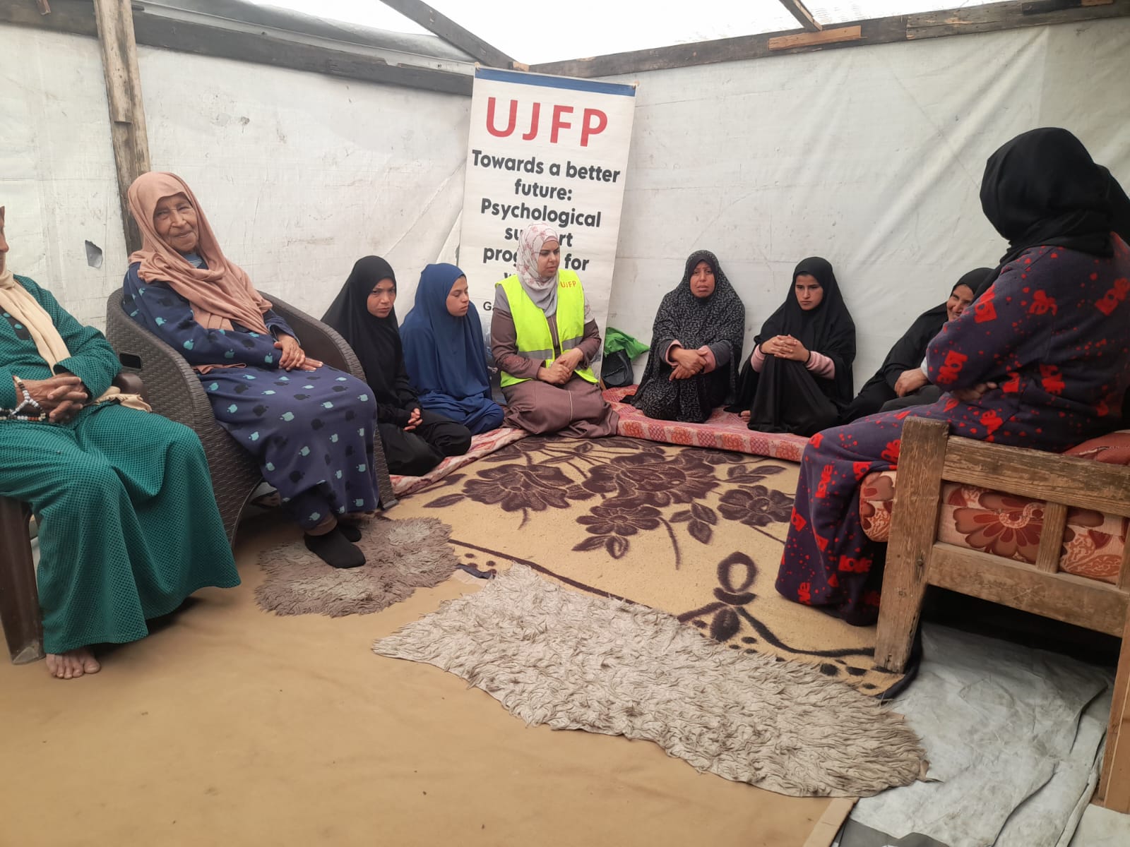 L’équipe de UJFP a organisé un atelier de soutien psychosocial pour les femmes déplacées dans le « camp Al-Asdiqaa », à l’ouest de Deir al-Balah. Cette rencontre a réuni trente femmes sous une même tente, chacune portant avec elle tout un univers d’histoires, de souvenirs et de craintes. Les femmes se sont assises en cercle simple ; certaines tenaient les mains de leurs enfants, tandis que d’autres regardaient le sol comme si elles rassemblaient le courage de commencer. Peu à peu, le silence s’est transformé en paroles, et les paroles en récits. Les femmes ont parlé des premiers jours du déplacement, du moment où elles ont quitté leurs maisons à la hâte, et du sentiment qui les a accompagnées lorsqu’elles ont compris que la route qu’elles empruntaient n’avait pas de destination connue. L’une des participantes a confié que ce qui lui fait le plus mal, c’est lorsque ses enfants lui demandent chaque soir quand ils rentreront à la maison, alors qu’elle-même n’en connaît pas la réponse.