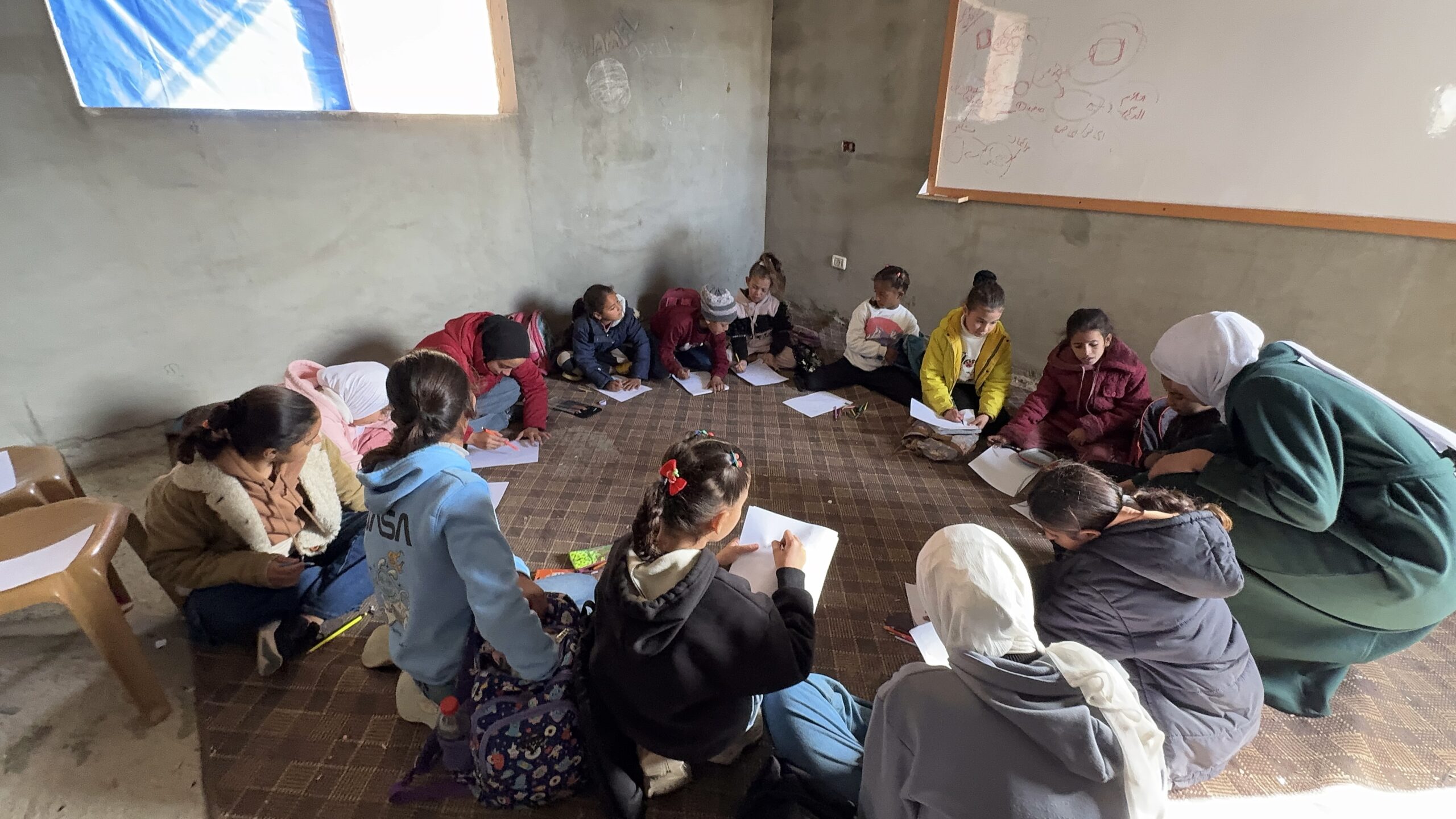 Le Centre éducatif Al-Fajr, situé dans la région d’Al-Mawasi à Khan Younès, accueille encore un grand nombre d’enfants qui y trouvent un espace sûr pour apprendre et s’exprimer. Il intervient pour les enfants d’agriculteurs qui ont été déplacés et ont perdu leurs terres, leurs maisons et leurs moyens de subsistance, mais qui refusent de renoncer à l’avenir éducatif de leurs enfants, faisant de ce centre une lueur d’espoir dans une réalité extrêmement difficile.