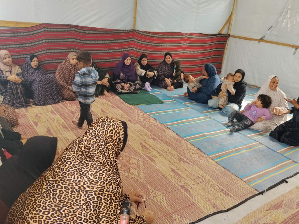 À l’ouest de Gaza, dans le camp d’Al-Israa, où les tentes s’étendent dans un espace étroit l’UJFP a organisé une séance de soutien psychologique pour 25 femmes déplacées, dans une tentative d’ouvrir un espace humain où elles peuvent reprendre leur souffle au milieu d’une réalité qui ne s’apaise jamais.