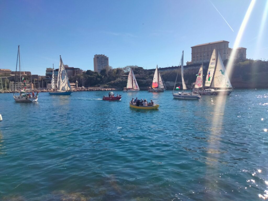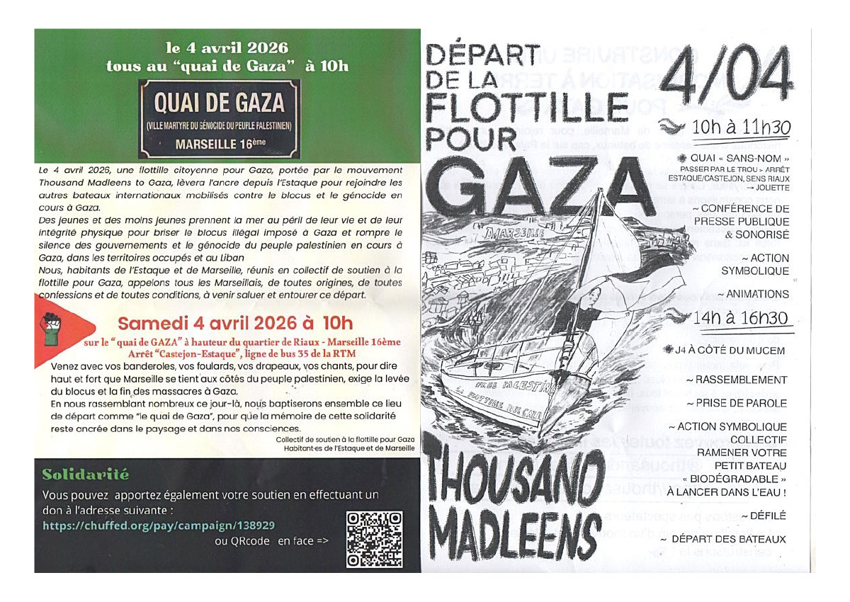 4 avril 2026Une très belle journée entière ce samedi 4 Avril entre l’Estaque, quai de Gaza où les bateaux se sont préparés depuis plus d’un mois soutenus par la population de l’Estaque/ Marseille et le MUCEM à l’avant du vieux port de Marseille où ils sont venus faire la parade avant de partir direction l’ Italie puis Gaza . Ils sont 20 Bateaux, dont deux de la Freedom Flottilla Coalition Française et rejoindront en mer ensuite la Global Sumud Flottilla, 60 bateaux qui partent le 12 Avril de Barcelone. 80 bateaux en tout pour briser le blocus de Gaza, à terre nous serons leurs yeux ce sera leur sécurité ! Ci dessous quelques photos, un article complet sur https://altermidi.org/ en début de semaine.