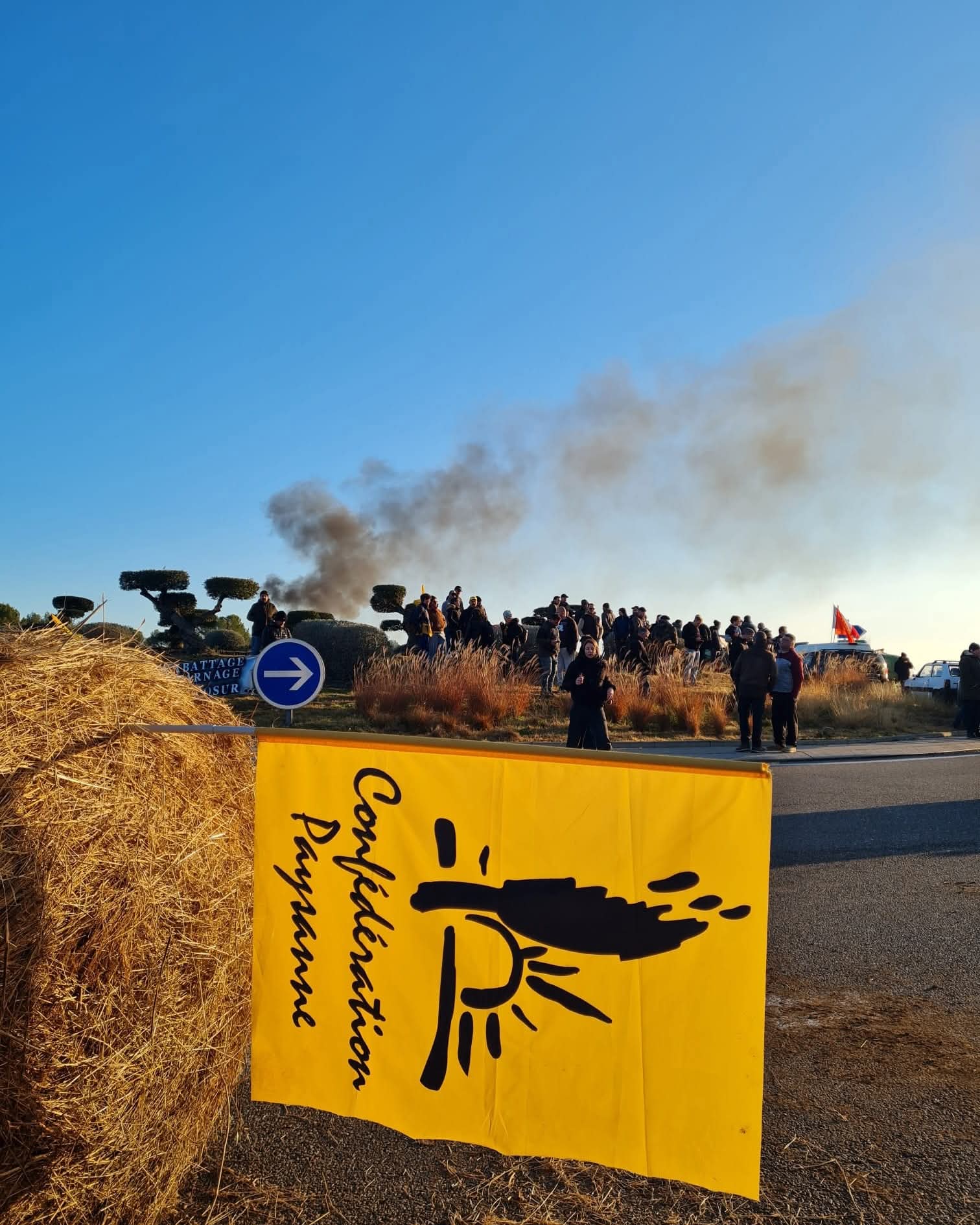 Une action appelée par la Confédération Paysanne* de l’Hérault a commencé sur le rond-point dimanche 14 décembre au matin. Depuis, plusieurs dizaines d’agriculteurs-trices s’y relaient. Aux côtés des membres de la Confédération Paysanne, des membres de la Coordination Rurale**, des Jeunes Agriculteurs,*** des paysan-nes non-syndiqué-es, des soutiens, des élu-es.
