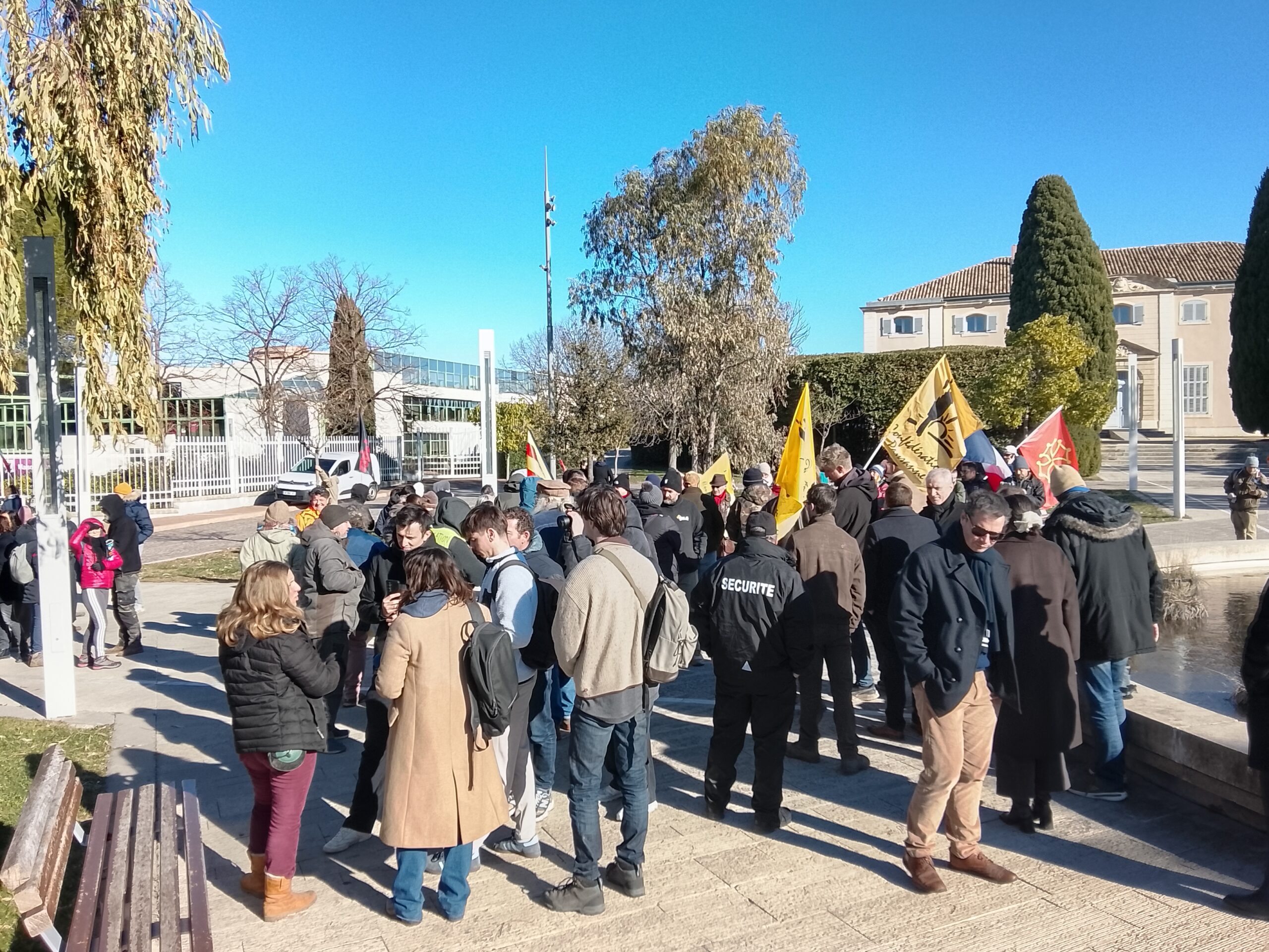 À Alco, les syndicalistes paysans sont rejoints par quelques soutiens, avec par exemple la présence de quelques membres de Solidaires Étudiant-es. Une délégation a pu rencontrer Kléber Mesquida, président du Conseil Départemental, et Yvon Pellet vice-président délégué à l’économie agricole et à l’aménagement rural, par ailleurs maire de Saint Géniès des Mourgues. Les deux élu-es ont affirmé leur rejet de la politique actuelle du gouvernement sur la dermatose. Kléber Mesquida a affirmé devant la foule avoir envoyé le 19 décembre une lettre au 1er Ministre, demandant une accélération de la vaccination, un renforcement des contrôles sur les déplacements de bétail, et une prise en compte des protocoles alternatifs proposés par les syndicats contestataires.