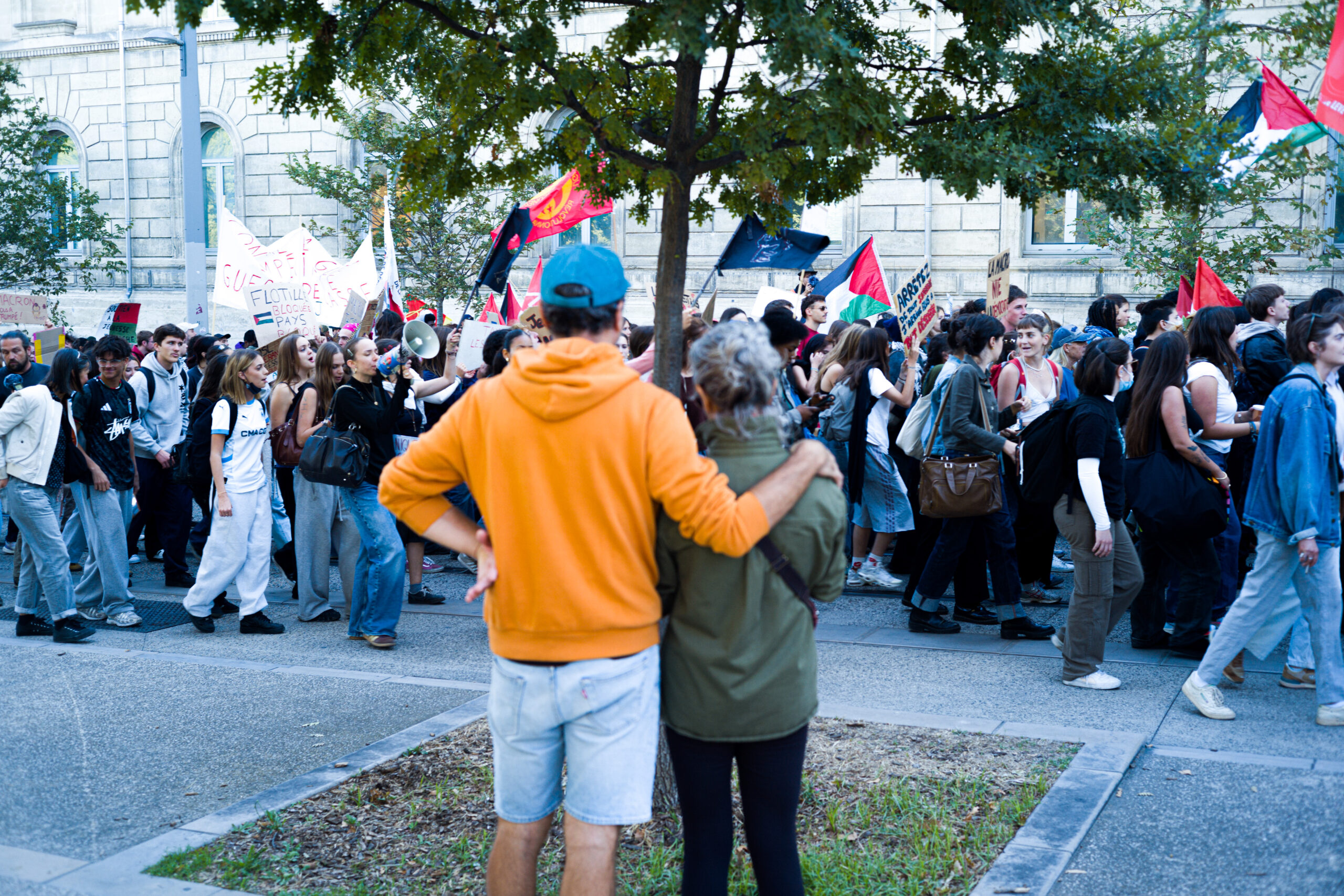 La manifestation, censée se terminer dans le quartier Antigone, s’arrête finalement sur la place de la Comédie, qui n’était pas prévu dans le parcours officiel. Plusieurs prises de paroles se succèdent. Françoise Saint-Joannis, représentante de la FSU, plaide pour un « tout autre budget », à quelques semaines des discussions sur le financement de l’État et de la sécurité sociale. « Pour l’instant, Lecornu n’a apporté ni engagements ni rupture par rapport à la copie présentée en juillet », commente-t-elle. L’intersyndicale demande une revalorisation des salaires dans la fonction publique, une taxation des plus hauts patrimoines, l’abandon de la prochaine réforme de l’assurance chômage et du doublement des franchises médicales, et le conditionnement des aides versées aux entreprises à des engagements en matière d’écologie.