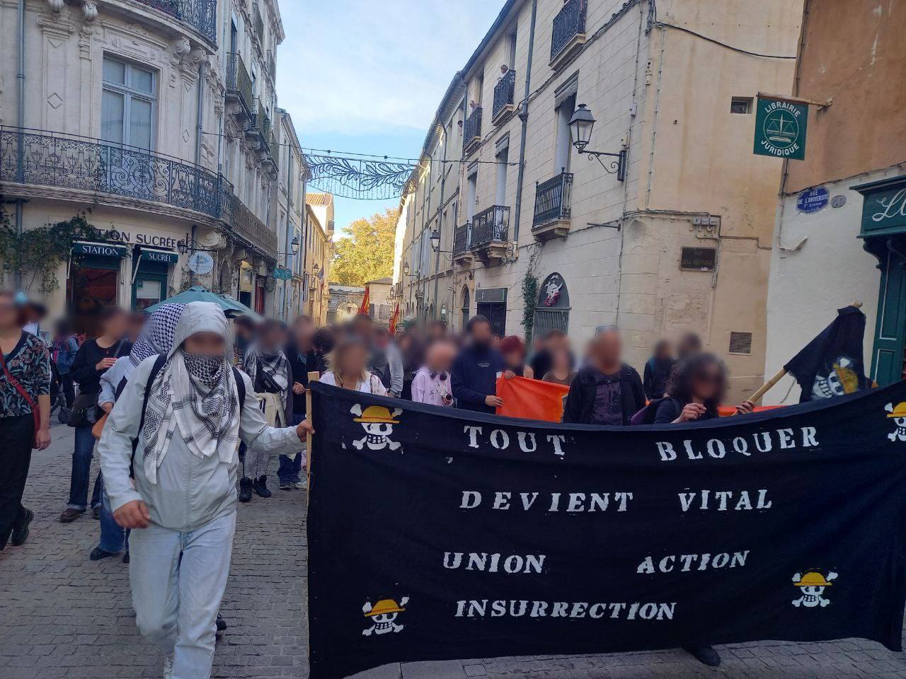 L’information tournait déjà depuis quelques semaines dans les boucles de messagerie du mouvement “Bloquons tout” : le 15 novembre serait la prochaine date de mobilisation. A Montpellier, 200 personnes ont manifesté dans les rues du centre-ville au son d’une fanfare. Si l’idée d’origine était de faire plusieurs groupes destinés à bloquer différentes cibles, le cortège, par manque de monde, s’est contenté de défiler de manière festive. Les magasins de l’enseigne Carrefour, accusée d’entretenir des liens avec des entreprises responsables de la colonisation en Palestine, ont été ciblés, mais les commerces ont rapidement rabattu leurs grilles au passage de la manifestation.