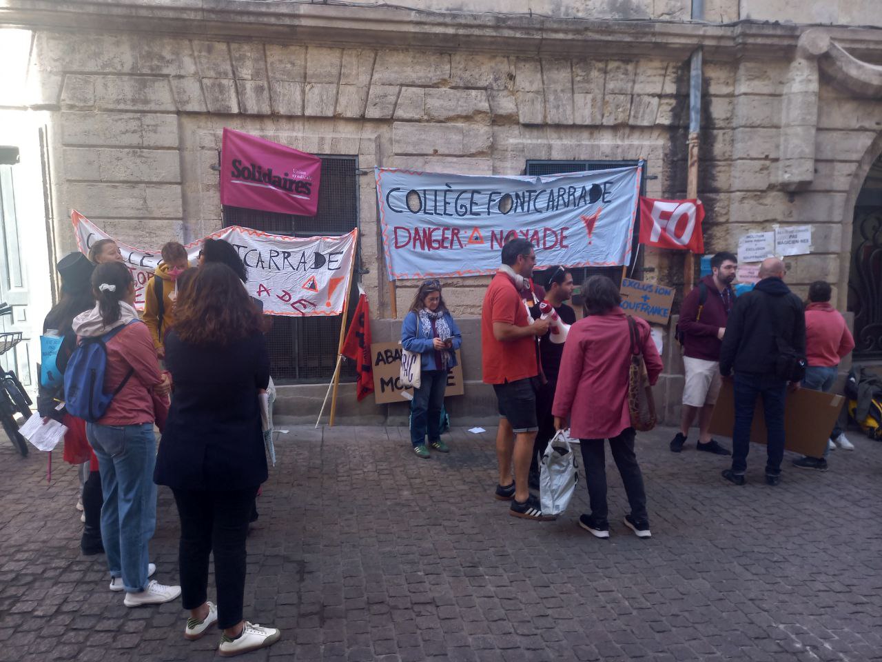 “Fontcarrade en rade, Fontcarrade en rade !” La chansonnette poussée par le personnel du collège Fontcarrade, réuni devant le rectorat ce mardi 7 octobre, résonne avec l’appel lancé la semaine dernière par les enseignants du collège des Escholiers de la Mosson, en grève eux aussi : une demande urgente de moyens, notamment pour des postes d’accompagnant d’élèves en situation de handicap (AESH).
